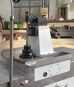 机床纵向采用滚珠丝杆传动(避免齿轮齿条传动不精确的缺点),数控系统自动控制,能实现一道孔型到下一孔型自动移动,定位精确,无需人工手动移动。
